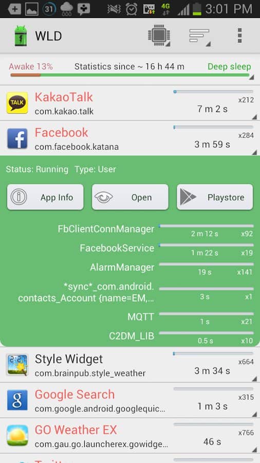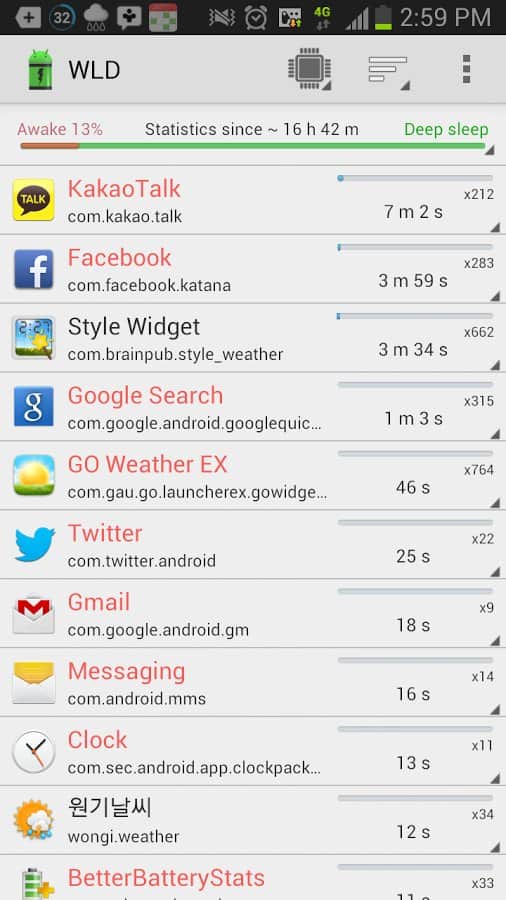 Wakelock Dedektörü, bu tür uyanmalarla ilgili istatistikleri toplamayı amaçlar ve akıllı telefonunuzun "uyumasını" engelleyen şeyin ne olduğunu belirlemenize yardımcı olur ve dolayısıyla pilin şarjını mantıksız bir şekilde tüketir. Elde edilen verileri farklı parametrelere göre düzenleyerek inceleyebilir ve sonuçları inceledikten sonra, pil tüketicileriyle ne yapacağınıza karar verebilirsiniz. Bu arada, gerçekten doğru istatistikler elde etmek istiyorsanız, akıllı telefonunuzu uygulama açıkken en az birkaç saat yalnız bırakın.