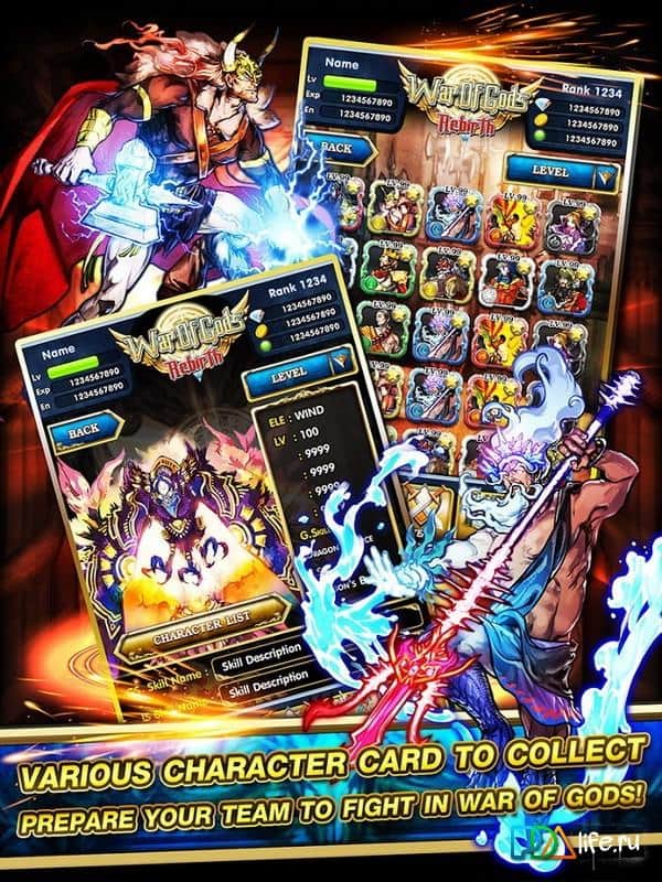 Tanrıların Savaşı: Yeniden Doğuş – güçlü tanrılara karşı koymanız gereken bir RPG unsurları içeren kart oyunudur. Uzak zamanlarda dünyada tanrılar hüküm sürüyor ve sel, depremler, yıldırım darbeleri ve yangınlar aracılığıyla yargı veriyorlardı. Yerin ruhları, bu tür yıkımlardan sonra yaşam yeteneklerini kaybetti ve güç dengesi bozuldu. Şimdi kahramanların tanrılara karşı eşit olmayan bir savaşa katılma zamanı geldi. Beğendiğiniz kahramanı seçin ve dünyada dengeyi yeniden sağlarken tanrılara karşı koyun. Kahramanlarınızı geliştirin ve canavarlara ve tanrılara karşı epik savaşlara katılarak büyük bir takım oluşturun. Gücünüzü artırın ve diğer oyunculara PVP arenasında meydan okuyarak birçok ödül kazanın.