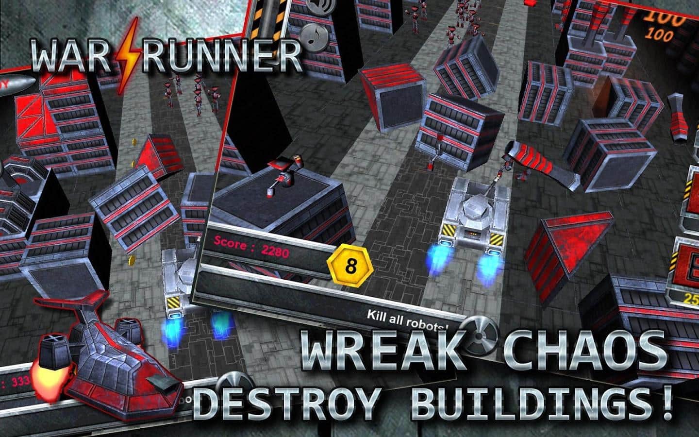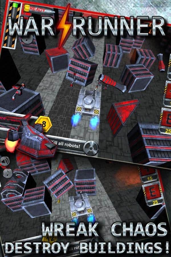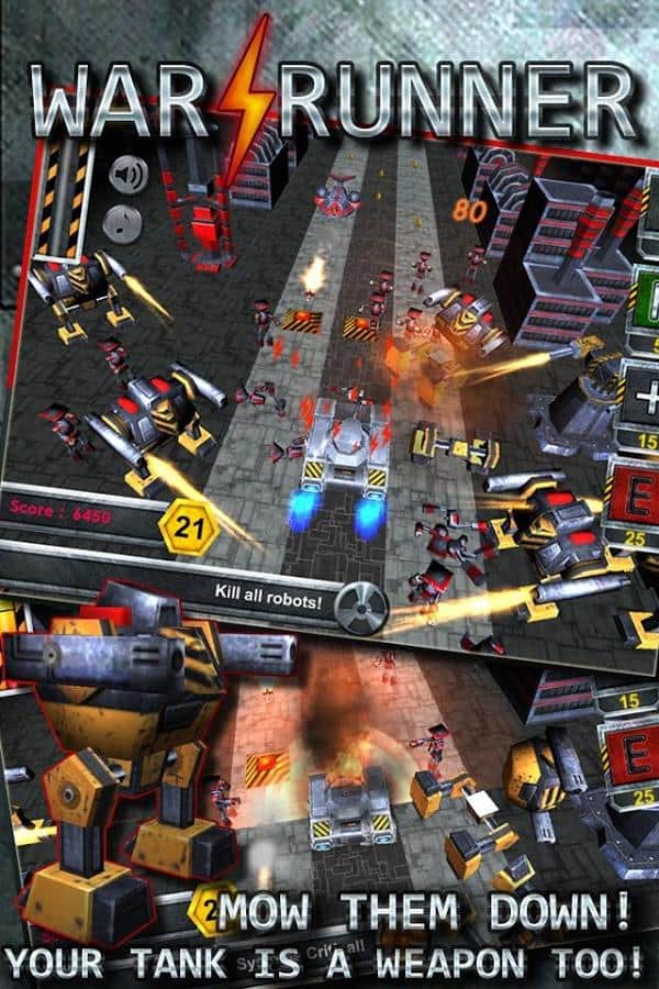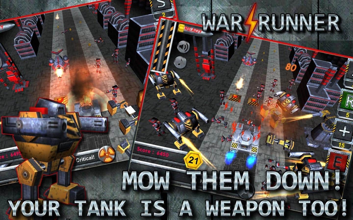 Savaş Koşucusu - Android için bir oyundur, burada tankınla düşmanın arka tarafına geçecek ve mümkün olduğunca çok yıkım yapmak için derinlere ilerleyeceksin. Tankını yönet, tüm engelleri aş ve yol boyunca robot şeklindeki düşmanları ezerek veya güçlü silahlar kullanarak yok et ve daha derinlere geç. Silahını veya tankını geliştirmene yardımcı olacak bonusları topla ve onu yenilmez hale getir.