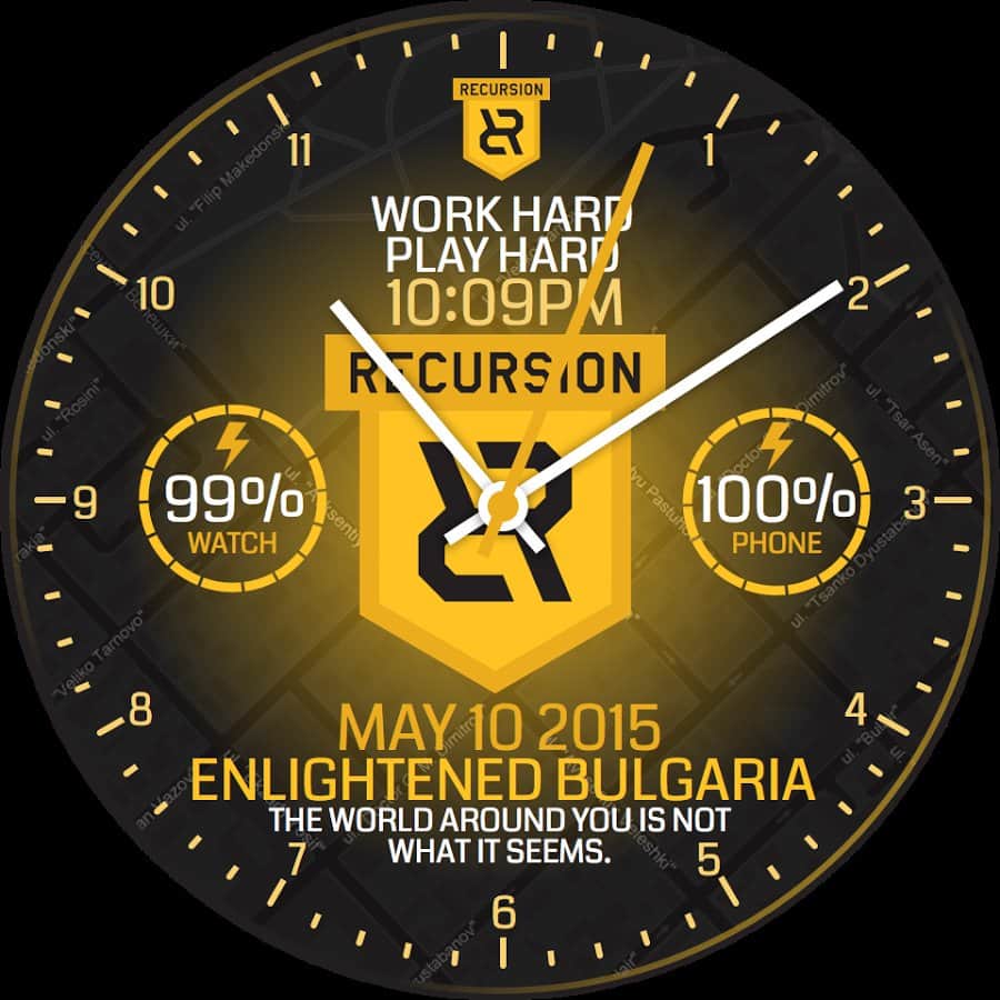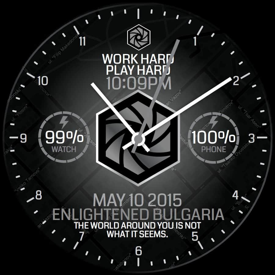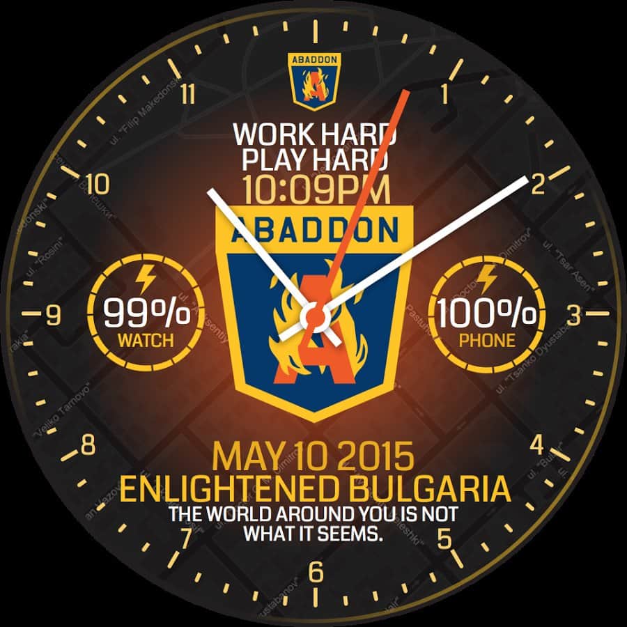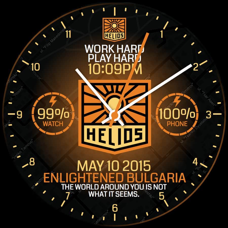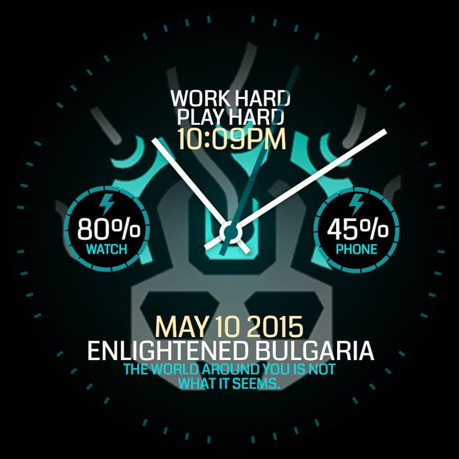 Saat yüzü, yukarıda bahsedilen oyunun tarzında tamamen tasarlanmıştır ve ayarlarda ona kişisellik katabilirsiniz: arka plan, renkler, gerekli bilgilerin gösterimi, zaman formatı ve hatta ekranda gösterilecek metni seçebilirsiniz.