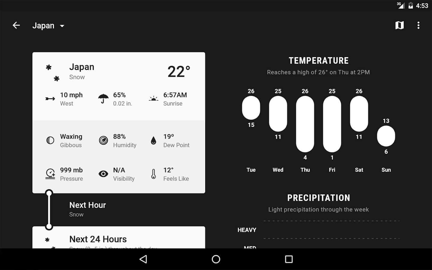 Hava Zaman Çizelgesi - Tahmin - Basit ama çok işlevsel bir Android uygulaması. Havanın her zaman nasıl olacağını bilmenize yardımcı olur. Programı tamamen kendinize göre ayarlayabilirsiniz. Gerçek zamanlı hava durumunu görüntüleme imkanına sahipsiniz. Ayrıca saatlik veya haftalık bilgileri görüntüleme seçeneğiniz de var. Eğer bir seyahat veya yürüyüş planlıyorsanız, program 48 saat boyunca hava durumu için ayrıntılı istatistikler sunacaktır.