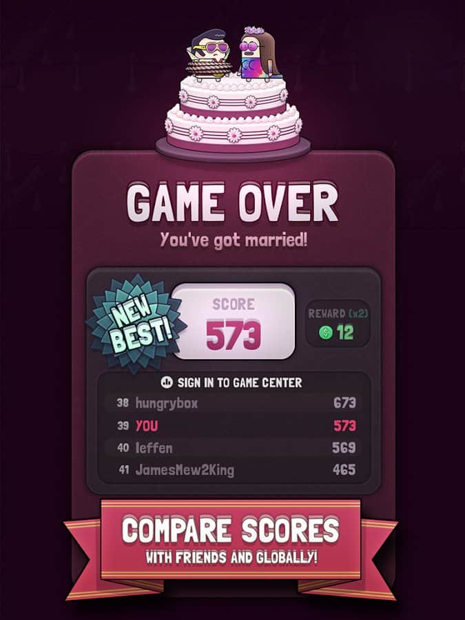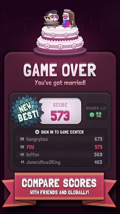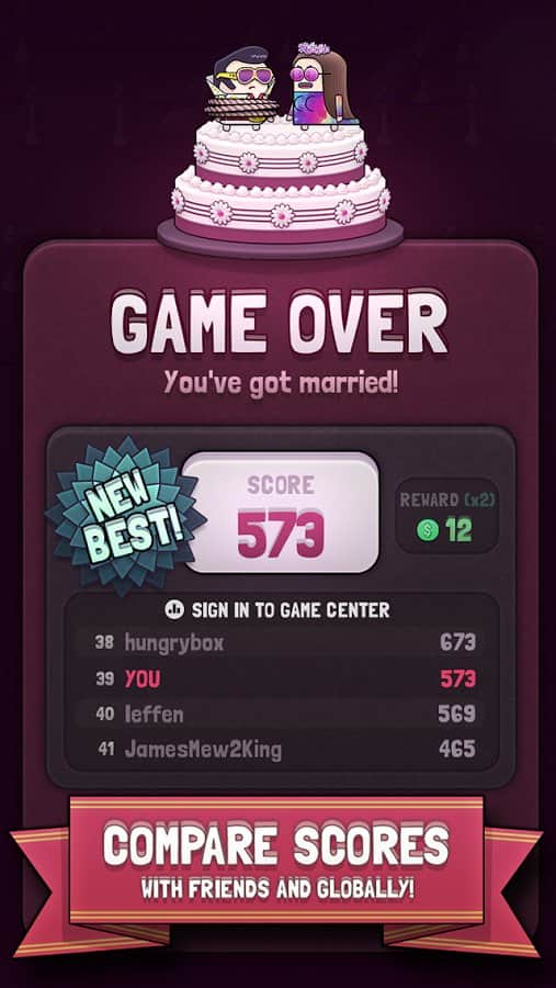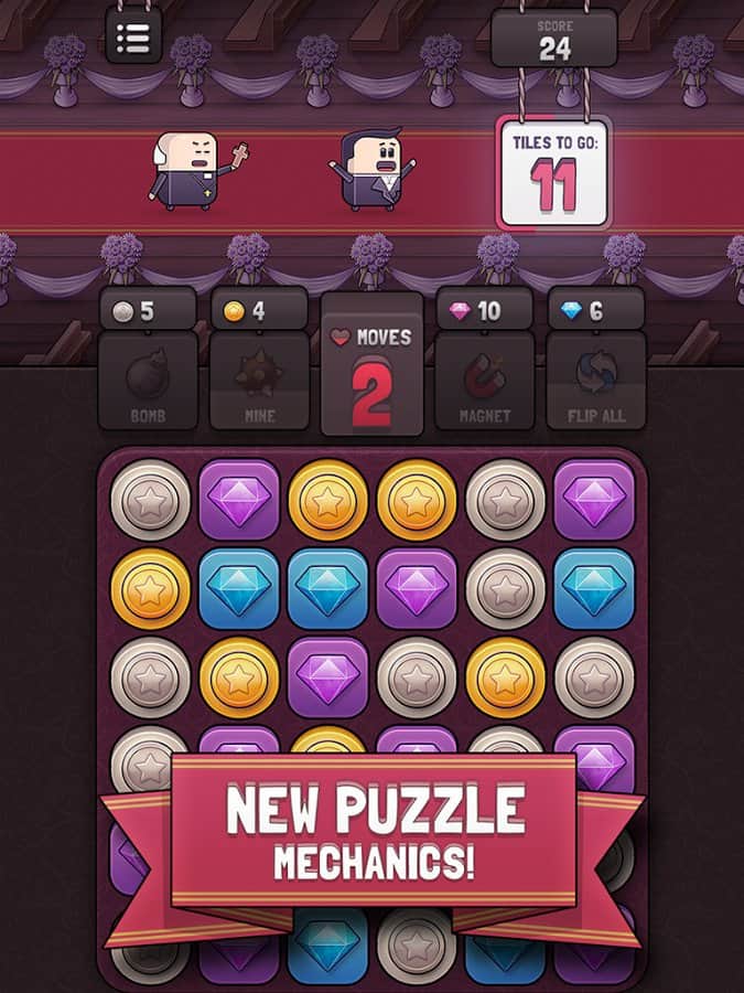 Düğün Kaçışı – yeni ve ilginç bir mekaniğe sahip 'üçlü eşleştirme' türünde bir oyun, burada damada düğününden kaçmasına yardım edeceksiniz. Düğün yapmaktan vazgeçen damadımız, düğünden kaçmaya karar verdi, ona bunu yapmasında yardım edin. Alanda sizi madeni paralar ve elmaslar bekliyor, bunları çevirip bir araya toplamanız gerekiyor. Ne kadar çok taş toplarsanız, damadınız o kadar hızlı koşacaktır; eğer sıranızı geçerseniz, yavaşlama kaçınılmazdır. Çok sayıda madeni para toplayın ve oyunda yeterince bulunan yeni heyecan verici seviyeleri keşfedin. 60'tan fazla karakteri açın ve oyundaki birincilik için arkadaşlarınızla rekabet edin.