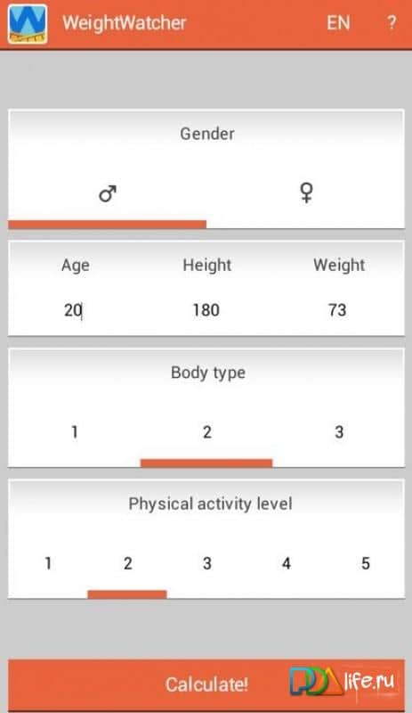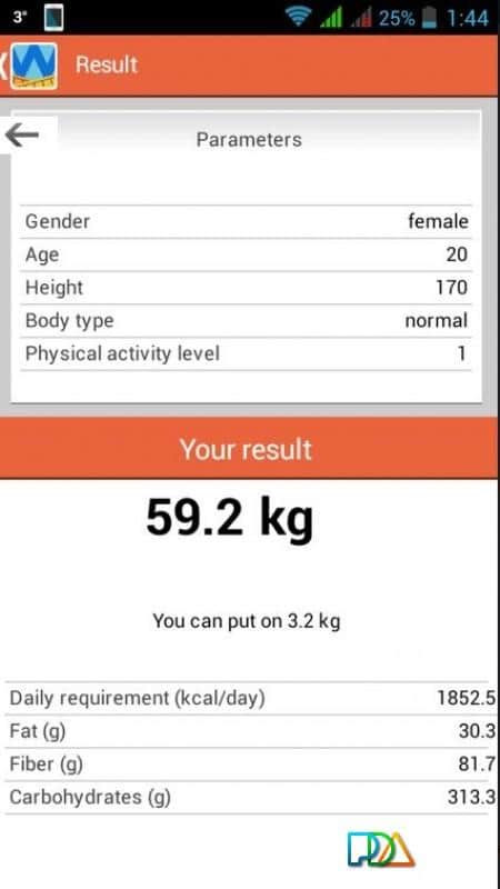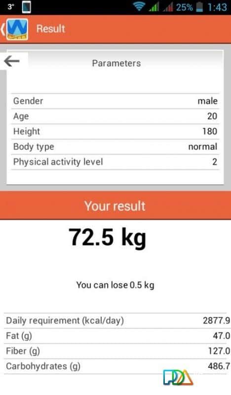 cinsiyet, yaş, boy, vücut yapısı ve fiziksel aktivite seviyesi. Bu verilere dayanarak uygulama, vücudunuz için optimal kalori, yağ, protein ve karbonhidrat tüketimini hesaplayacaktır. Elde edilen verilere uyun ve kilo verebilirsiniz.