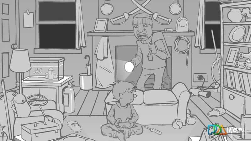 Hırsızı Vur – ebeveynler 8 yaşındaki çocuklarını evde yalnız bırakıp arkadaşlarının yanına akşam yemeğine gittiler. Bu fırsatı hemen değerlendiren bir hırsız, küçük çocuğun onun cesur soygun planını gerçekleştirmesi için bir engel olmadığını düşünmektedir. Oyun, çocuğun oyun konsolunda heyecanla oynadığı odaya sizi götürüyor. Ve işte, hırsızın arkasında olduğunu hissediyor. Onu elinizdeki herhangi bir nesneyle iyice vurmanız gerekiyor. Hırsıza zarar vermenin tüm yollarını bulun. Oyun gri tonlarda yapılmıştır.