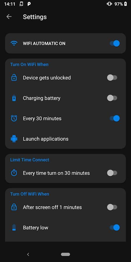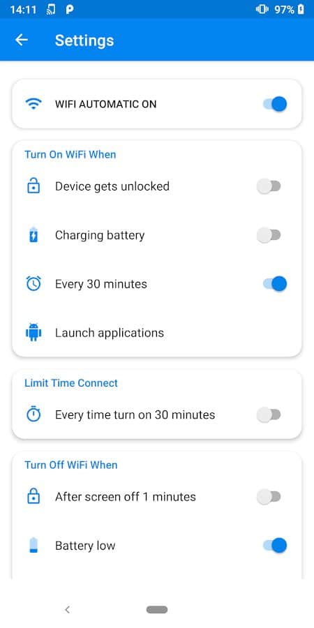 WiFi Otomatik - WiFi otomatik bağlanma, Wi-Fi bağlantısını otomatik olarak bağlanma ve durdurma konusunda size yardımcı olur. Uygulamada çeşitli işlevler bulunmaktadır ve bunlar uyumlu ve basit bir tasarımla sunulmuştur. Ana işlevler belirgin bir şekilde vurgulanmıştır, bu nedenle programı öğrenmekte sorun yaşamayacaksınız.