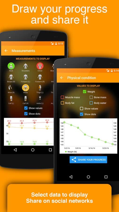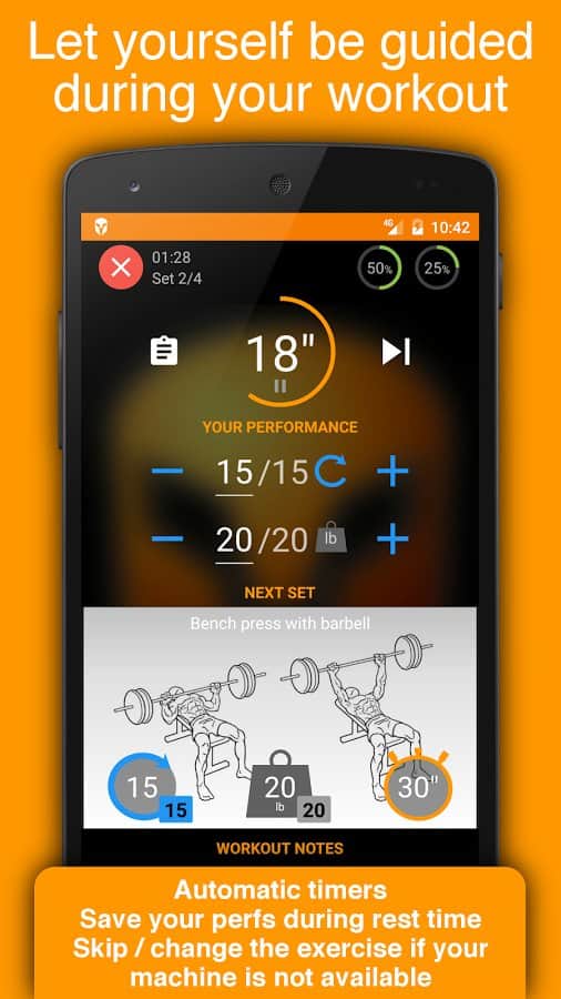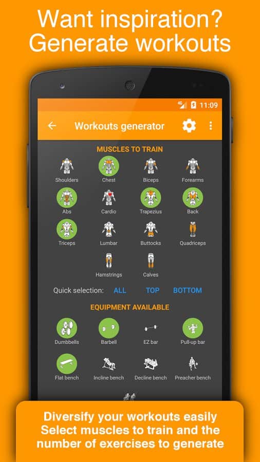 - 100'den fazla önceden tanımlanmış fitness ve güç egzersizi, kas gruplarına göre sınıflandırılmıştır: karın, ön kol, biceps, sırt, omuz, kalça, bel, baldırlara ve göğüs kasları, kuadriseps, trapez, triceps.