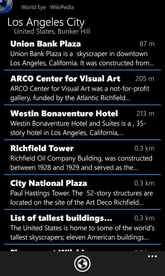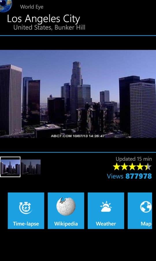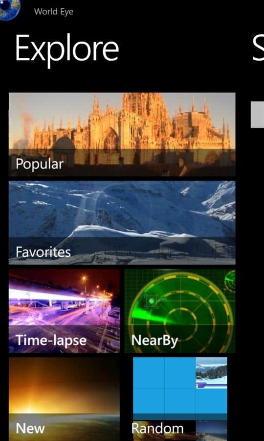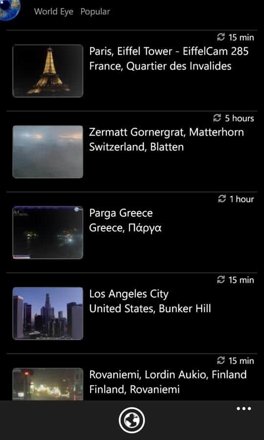 Dünya Göz - dünya genelindeki 25000 web kamerasına erişim sağlayan bir windows phone uygulamasıdır. Artık dünyanın dört bir yanındaki kameralarla statik resimlere hayran kalabilirsiniz. Ayrıca program, kameranın haritadaki konumunu gösterir. Eğer web kamerasının etrafında neler olup bittiğini merak ediyorsanız, olay yerinden canlı yayın izlemek için bağlantı içeren 'Vikipedi' makalelerini görüntüleyebilirsiniz.