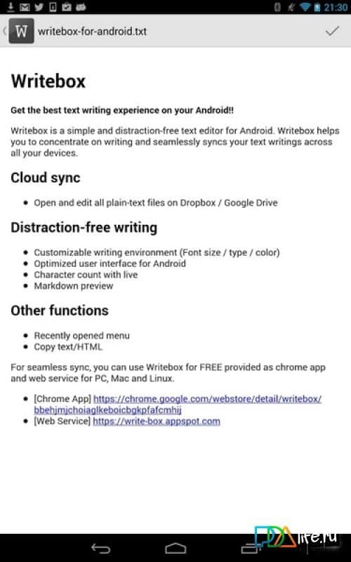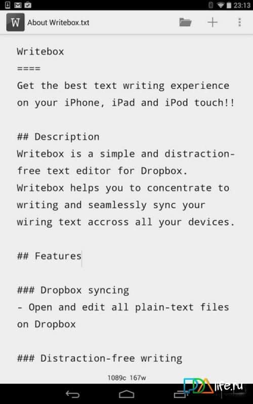 Writebox - notlarınızı ve aklınızda tutmanız gereken diğer önemli anları yazabileceğiniz basit bir not defteri. Programda gereksiz hiçbir şey yok, sadece yazmayı rahatça yapabilmeniz için gerekli olan her şey mevcut. Uygulama, yazmaya odaklanmanıza yardımcı olur ve metin notlarınızı tüm cihazlarınızda kolayca senkronize eder. Bu, Google'ın Dropbox hizmeti aracılığıyla gerçekleştirilir.