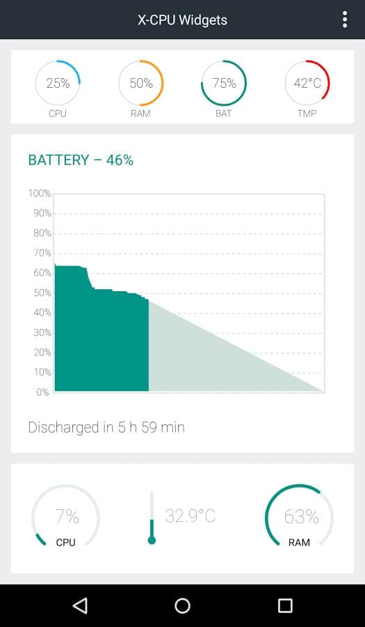 X-CPU - Daire Widget'ları - Cihazınız hakkında bilgileri doğrudan ekrana çok güzel widget'lar kullanarak yazdırın. Bu, cihazınızla ilgili temel bilgileri toplayan basit bir uygulamadır; ayrıca RAM'inizin ne kadar dolu olduğunu, bataryanın ne kadar şarjı olduğunu ve işlemcinin ne kadar güçlü çalıştığını gösterir. Tüm bu verileri topladıktan sonra, ekranınıza kaç tane ve hangi kaynakları kullandığınızı hemen görebileceğiniz birkaç kullanışlı widget eklemenizi önerir. Widget'lar oldukça çekici ve basit bir arayüze sahiptir.