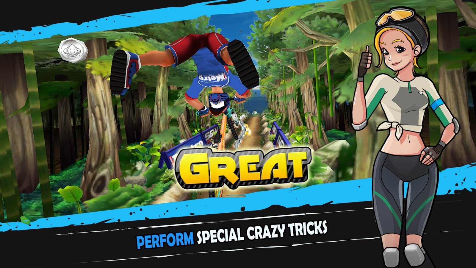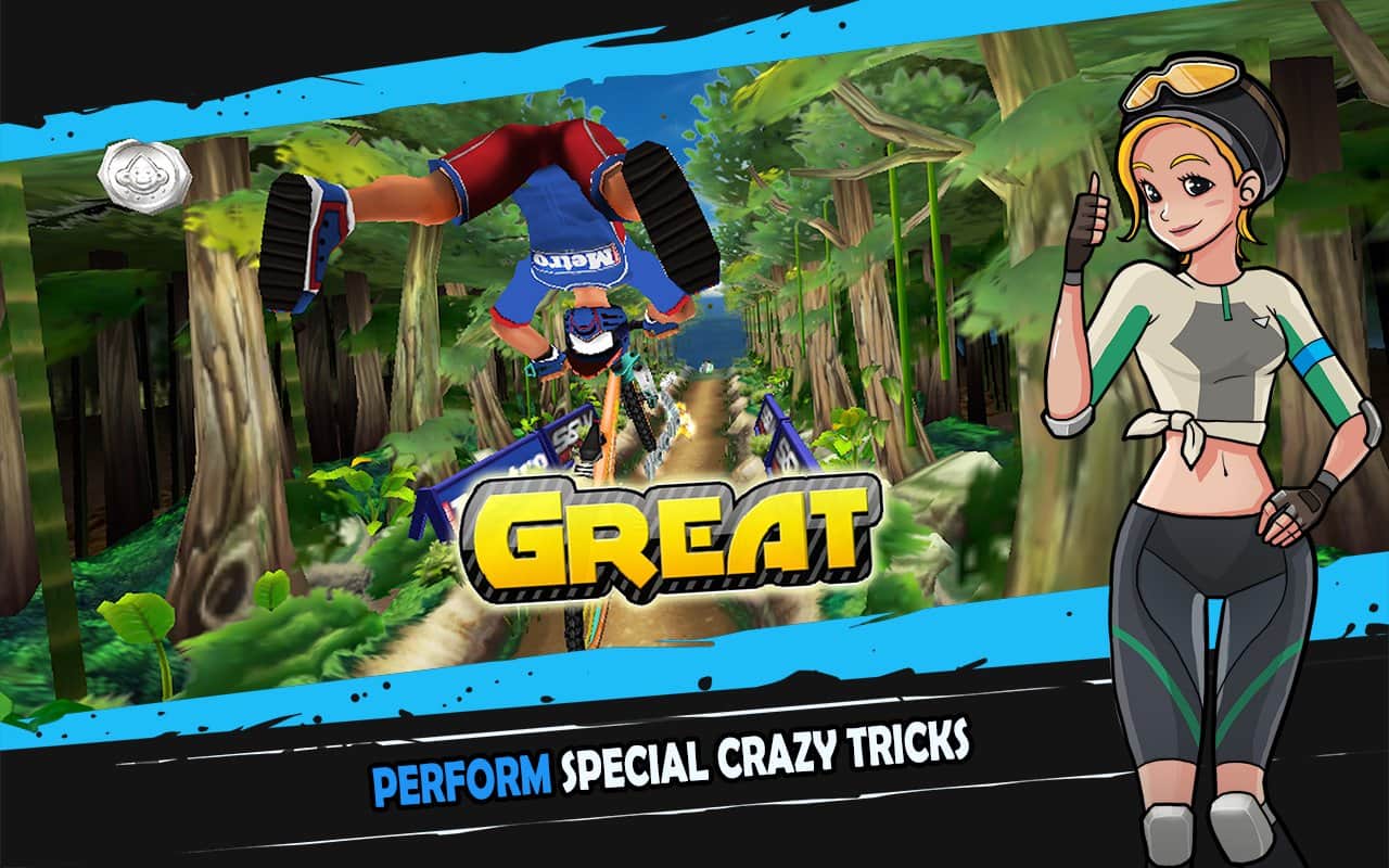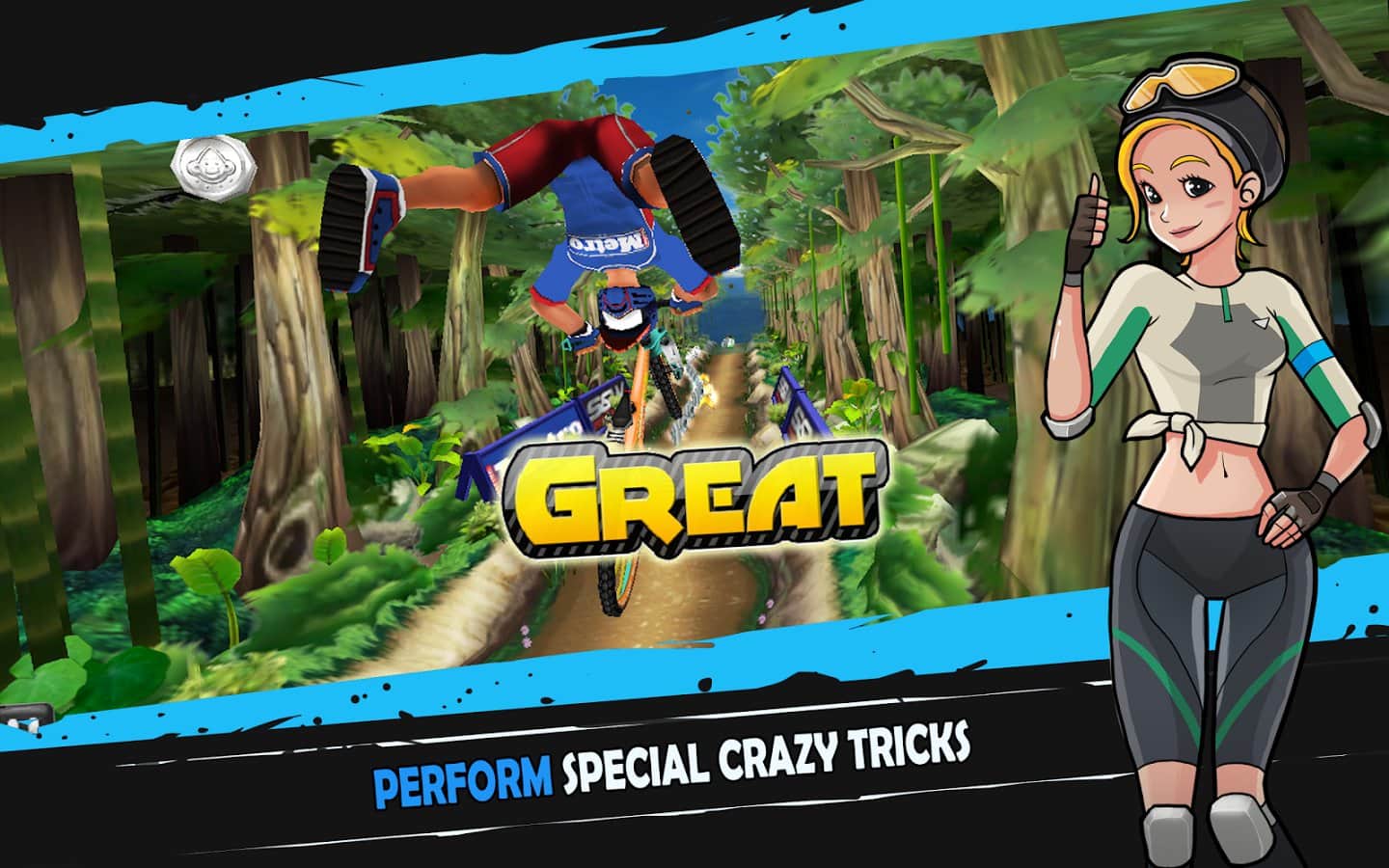 Xcite Dağ Bisikleti - Android için spor odaklı sıradışı bir koşucu. Bisikletle ormanda dolaşacak ve para toplayacaksınız, bu arada uzun atlayışlar yaparak çeşitli numaralar gerçekleştireceksiniz. Bunun için ekranda belirecek kombinasyonu yapmalısınız. Tüm yolculuğunuz, uçurumlar, ağaç kütükleri, dar geçitler gibi 20 farklı engelin bulunduğu yedi farklı bölgede geçecek. Oyun boyunca, profesyonel bisikletçilerin kullandığı çoğu numara da dahil olmak üzere on sekiz farklı numara öğrenmiş olacaksınız. Ayrıca oyunda karakterinizi giydirme veya ona yeni bir bisiklet alma imkanı da var.
