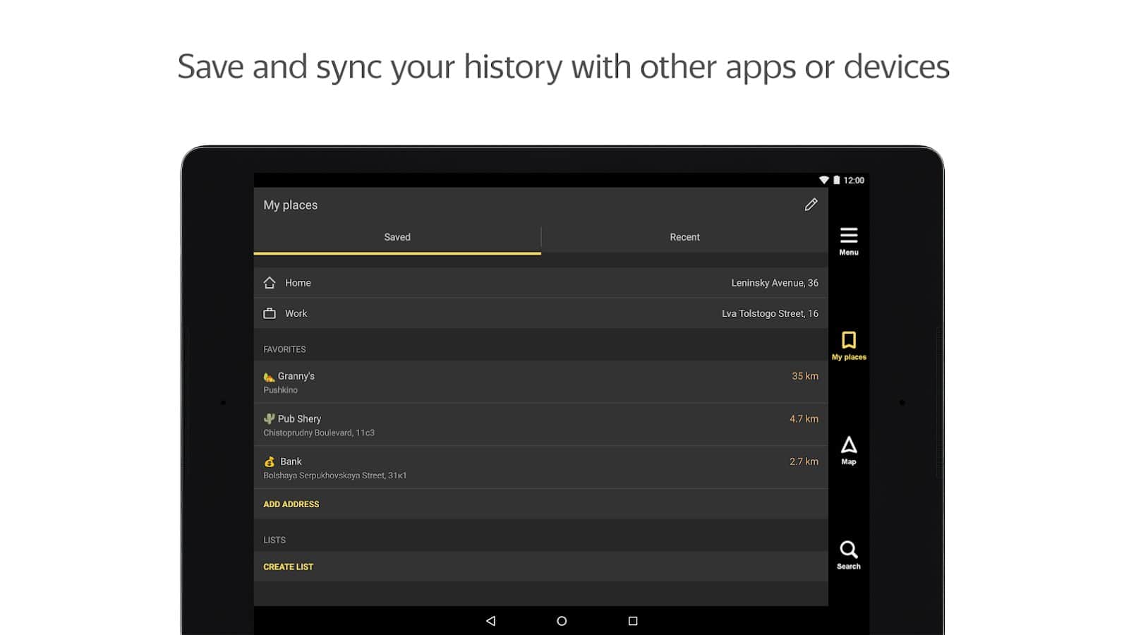 - Gerekli adresleri Favorilere kaydeder, böylece onlara hızlı bir şekilde rota oluşturabilirsiniz;