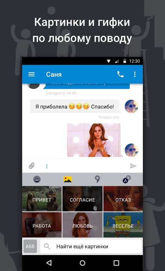 - Farklı konular için hazır gif setleri ve internette resim aramak için kullanışlı bir arama mevcut