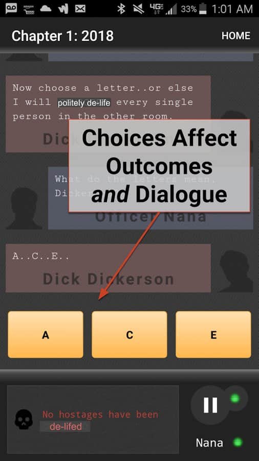Yıl 2053 (Sesli Metin Macerası) – Android için sürükleyici bir interaktif oyun, burada rehinelerin kaderini belirleyeceksiniz. Dick Dickerson, rehineleri aldı ve polisle müzakere etmek için çok kötü bir ruh hali içinde. Bu oyunda, rehineleri kurtarmak için suçlularla müzakere etme sorumluluğu verilen yeni bir polis memuru olarak rol alacaksınız. Sorularınız ve cevaplarınız, oyunun ilerleyen hikayesini ve devam eden diyalogun biçim ve içeriğini doğrudan etkileyecektir. Her cevabınızı dikkatlice düşünün, çünkü bu, rehin alınan insanların kaderini belirleyecektir. Bu oyunda iyi bir sonuç elde etmek için duygularınızı kontrol altında tutun.