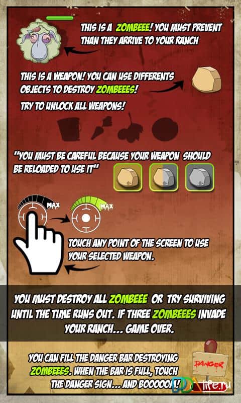 Eğlenceli windows phone 7 için oyun çiftçi için. Bir gün güzel bir günde uyanıyorsunuz ve çiftliğinize gidiyorsunuz, hayvanlarınızı beslemek için: inekler, buzağılar, koyunlar ve diğerleri. Ve aniden koyunların zombi haline geldiğini ve size saldırmaya çalıştıklarını, tüm yemlerinizi almak istediklerini veya belki de sizinle akşam yemeği yemek istediklerini görüyorsunuz. Kendinizi savunun elinizden geldiğince! ve belki hayatta kalacaksınız.