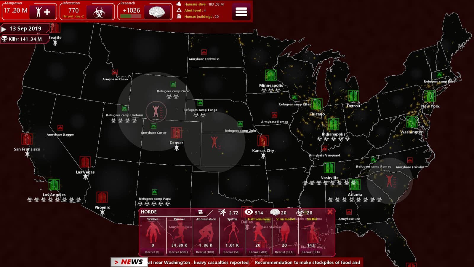 Zombi Komutanı – Android için bir strateji oyunu, burada tehlikeli virüsü Amerika Birleşik Devletleri'nde yayacaksınız. Göreviniz, virüsü mümkün olan en hızlı şekilde yaymak ve böylece tüm insanlığı yok etmektir. Enfekte olmuş birini kontrol altına alın ve onu çeşitli haritalarda yönlendirin, yerel halkı, orduları ve mültecileri enfekte edin. Tüm insanlığı en kısa süre içinde yok edin ve çeşitli türlerde tam zombi orduları oluşturun. Ordunun ve bilim insanlarının virüse karşı bir ilaç bulmasına izin vermeyin ve işinizde çeşitli teknolojileri kullanın.