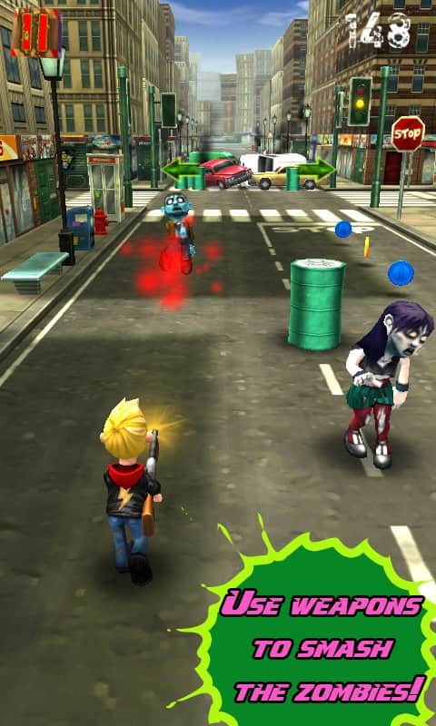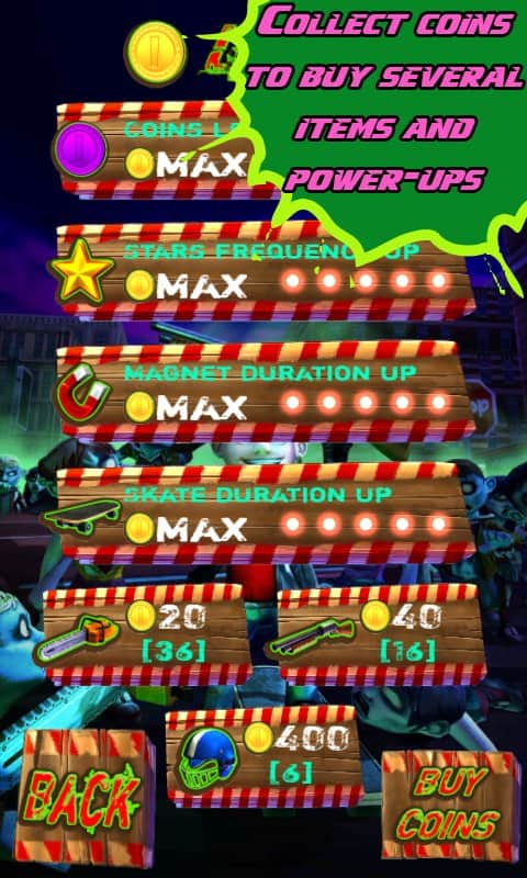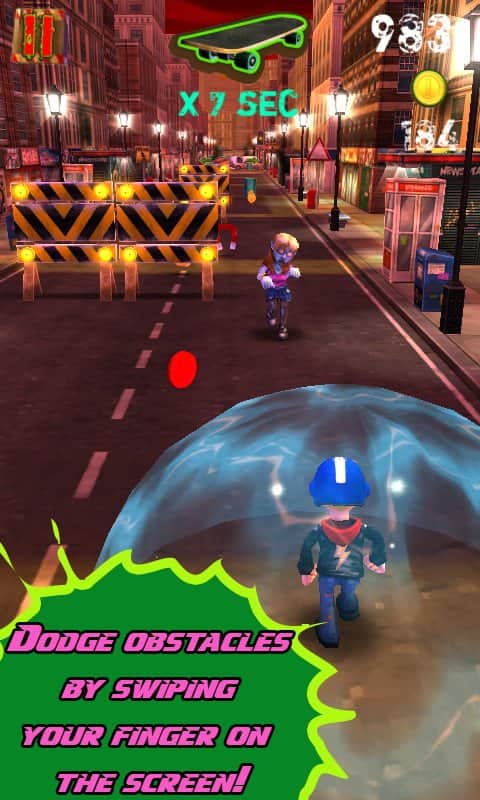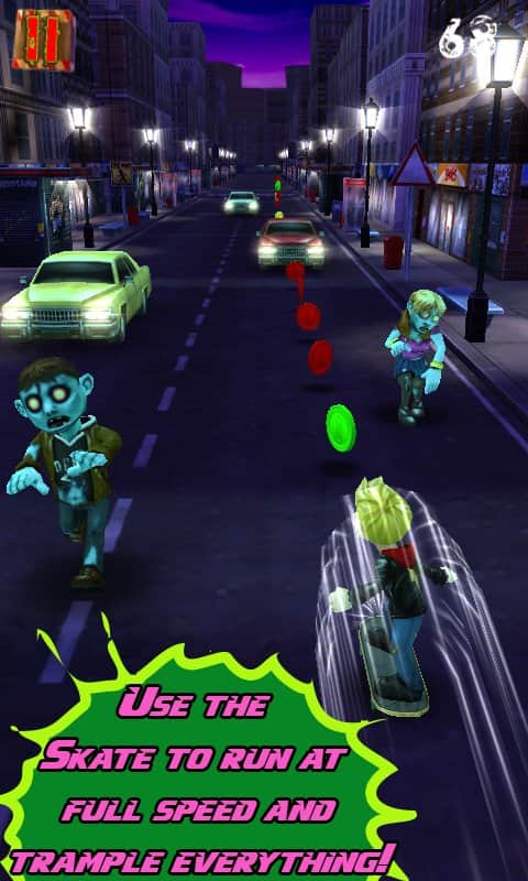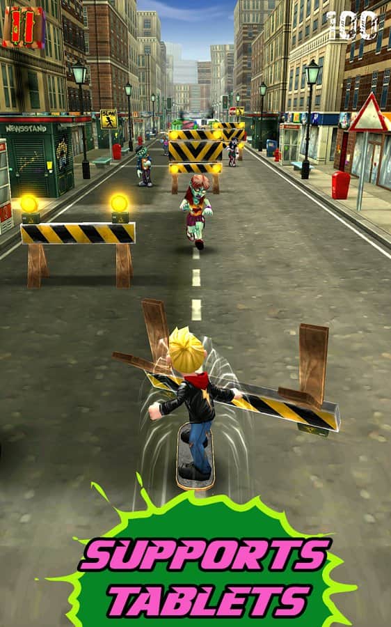 Zombiler Peşimde! - Şehriniz aç gözlü zombiler tarafından ele geçirildi ve tek amacınız bu iğrenç canavarlardan kurtulmak. Testere ve pompalı tüfek ile yürüyen ölülerin arasından geçin. Kaykayınızı ve akrobatik yeteneklerinizi kullanarak tüm engelleri aşın ve yol boyunca dağılmış patlayıcı varilleri geçin. Gerekli eşyaları satın almak ve sanal dükkanda bonuslar almak için paraları toplayın.